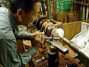| この地下工場では、貴金属のヘラシボリを専門に行っている。肩にヘラを当ててシボル、という特殊技法。 |